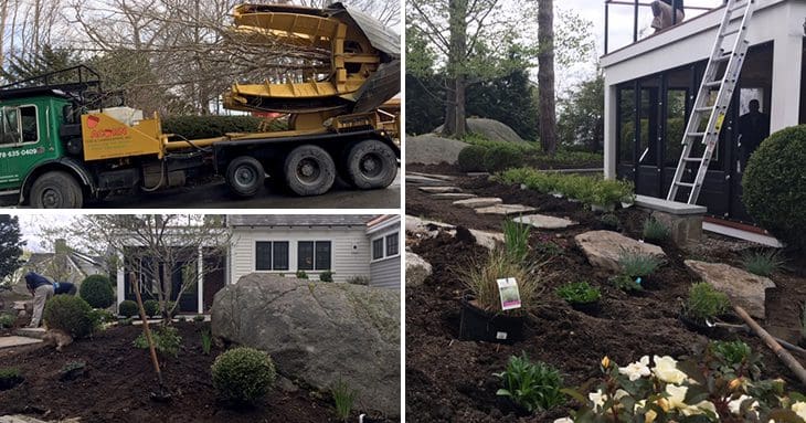 Once the new hardscape was set in place, it was time get to work on the softscape to complete our project. In addition to installing new plants, we relocated a Japanese stewartia from the corner of the house to the corner of the driveway. This proved to be quite a task, but our skilled crew got it done in no time at all. Our plantings include: white shrub roses, Russian sage, butterfly bushes, endless summer hydrangeas, overdam grasses, deutzia, geranium, dianthus and ground cover sedum.