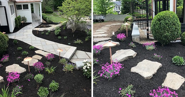 Our client wanted a fresh new look that would complement their new addition. From a design standpoint, we wanted the patio makeover to seamlessly blend in with its surroundings. Therefore, we used natural stone for all surfaces. First we laid bluestone for the patio and walkways – the back patio includes a reclaimed granite inlay. The natural colors in the bluestone reflect hues of the sky and the earth. Then we used granite for the steps, walls and caps. The durability of granite will stand the test of time.